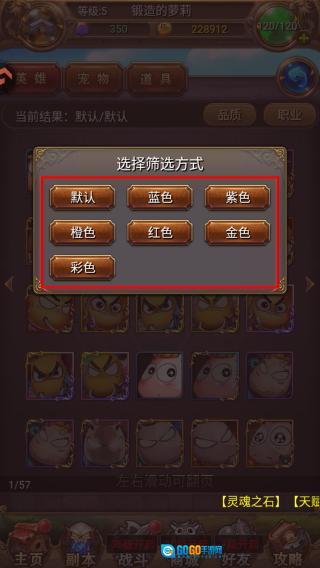 3、在英雄界面选用【默认-蓝色-紫色-橙色-红色-金色-彩色】这样的筛选方式,能够快速筛选出对应品质的英雄。