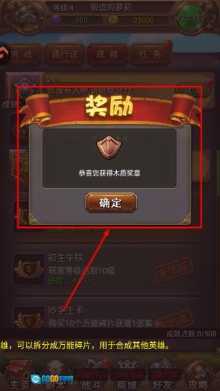 2、达成成就条件并领取奖励后,会弹出包含奖章的奖励窗口,点击【确定】关闭窗口即可继续后续操作。