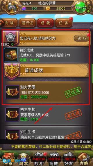 1、进入成就界面查看各项进度,像【初战成就】和【潜力无限】这类成就,等满足达成条件后就去领取对应的奖励,以此助力战力提升。