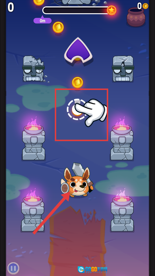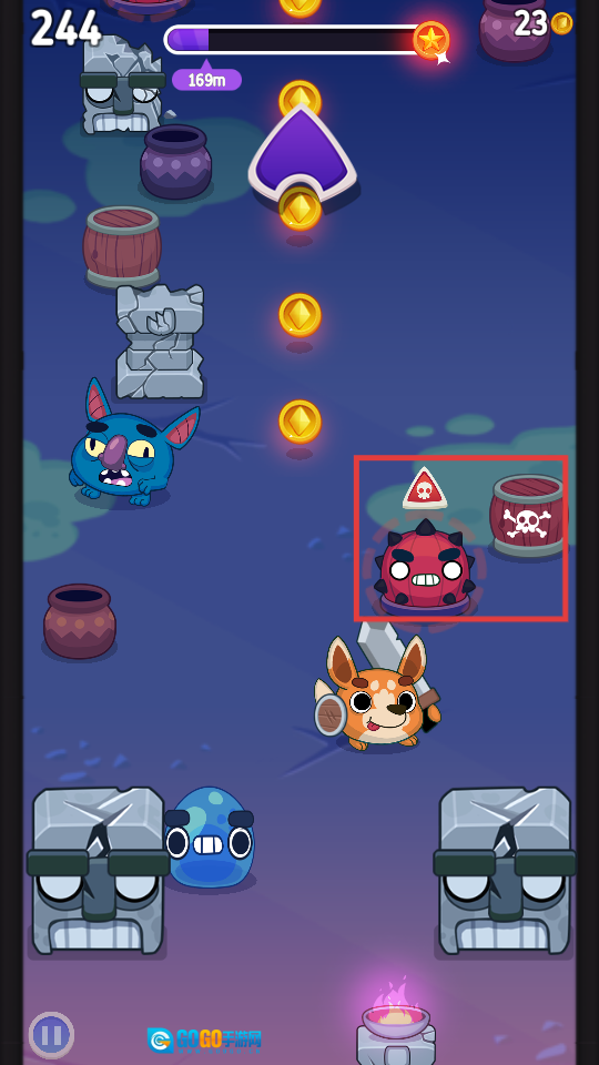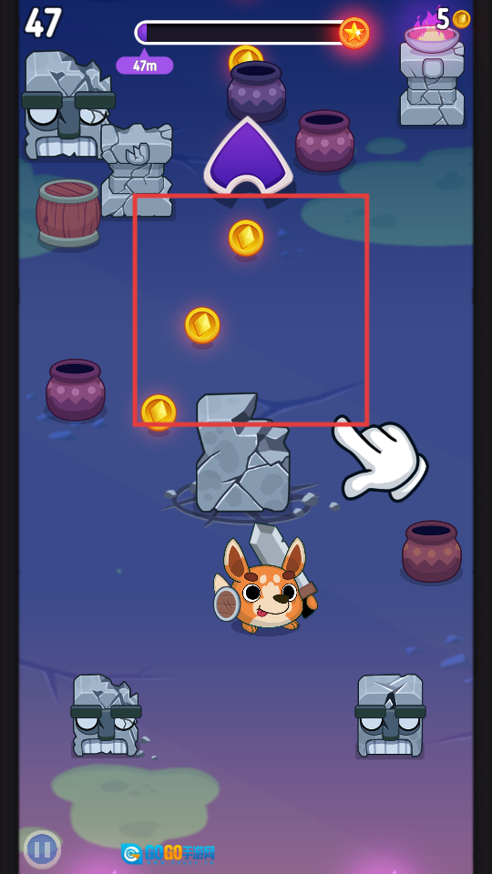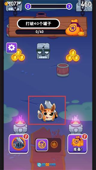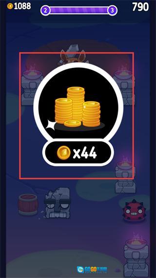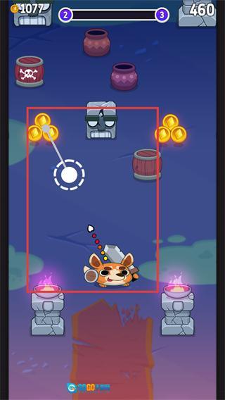 2、滑动控制角色发射方向,击中场景内的【罐子】【木箱】等物体,能获取对应的【金币】奖励。