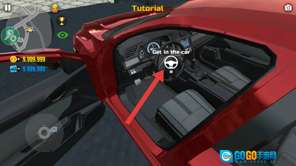 3、车门打开后,点击方向盘处的【Get-in-the-car】标识,进入驾驶位,准备启动车辆。