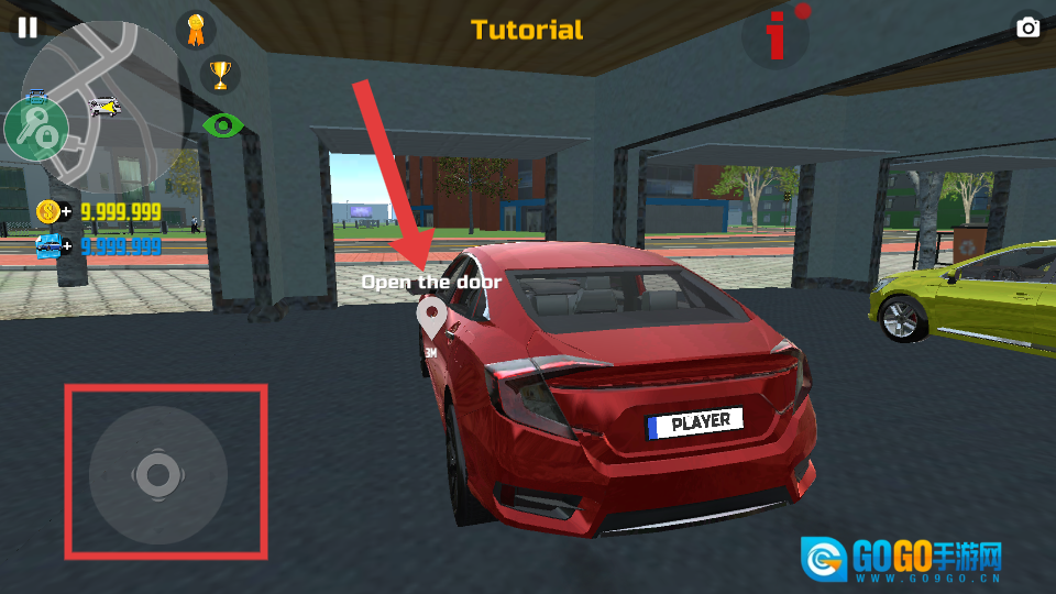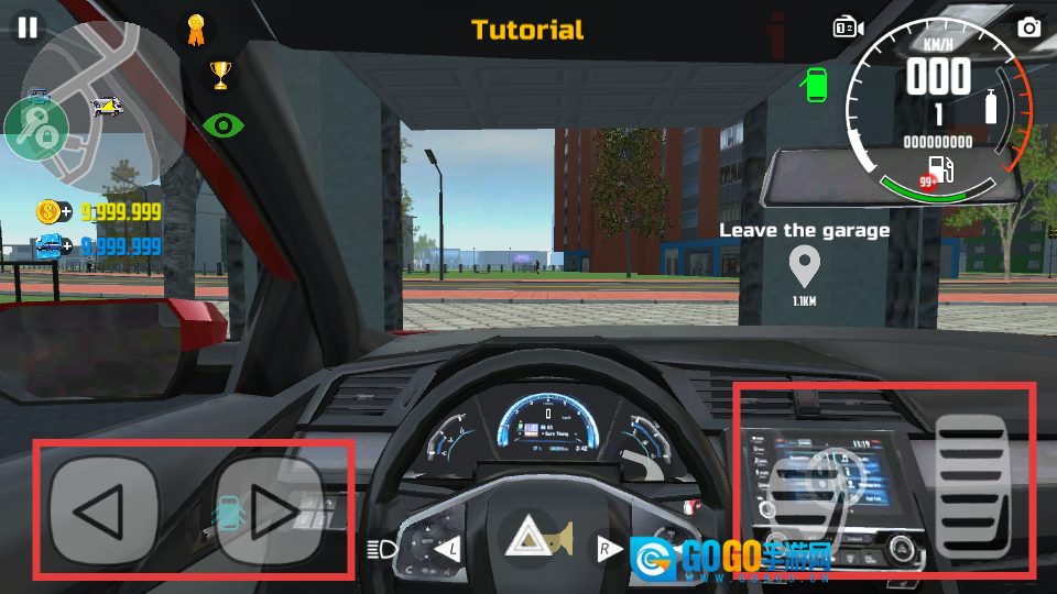 4、进入车内后,利用左侧方向控制和右侧操作按钮,驾驶车辆离开车库,完成【Leave-the-garage】教程任务。