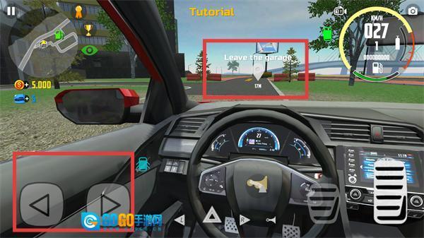 1、在【Tutorial】场景中,通过左侧【方向键】控制车辆转向,朝着【Leave-the-garage】标识的目标点行驶。
