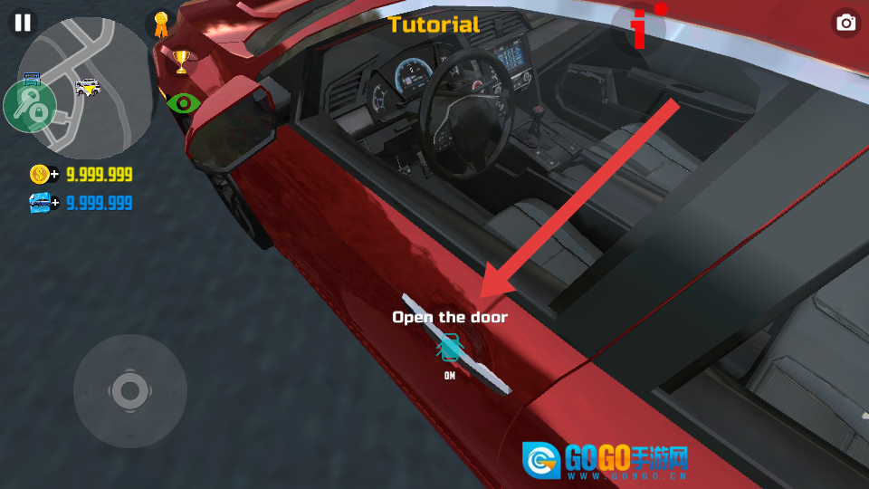 1、进入游戏后,找到红色车辆,点击【Open-the-door】标识,完成开门操作,开启驾驶流程。