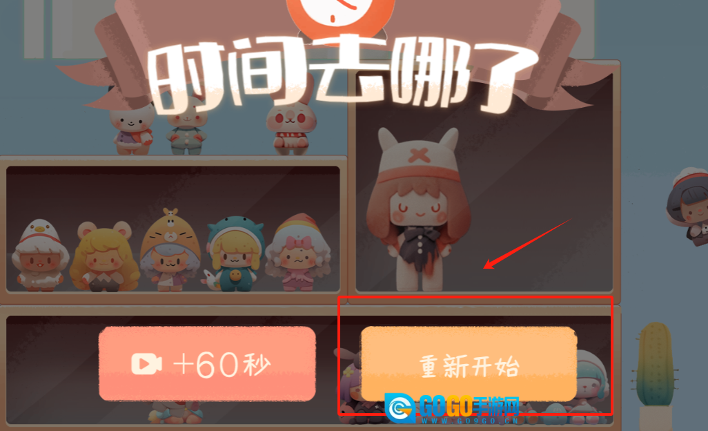 3、在“时间去哪了”的上方,有一个+60秒的按钮,点击它可以延长游戏时间;若想重置关卡,则可以点击重新开始按钮。