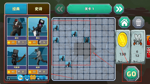 2、玩家需要用金币购买各类兵种,并对其进行合理的排兵布阵。