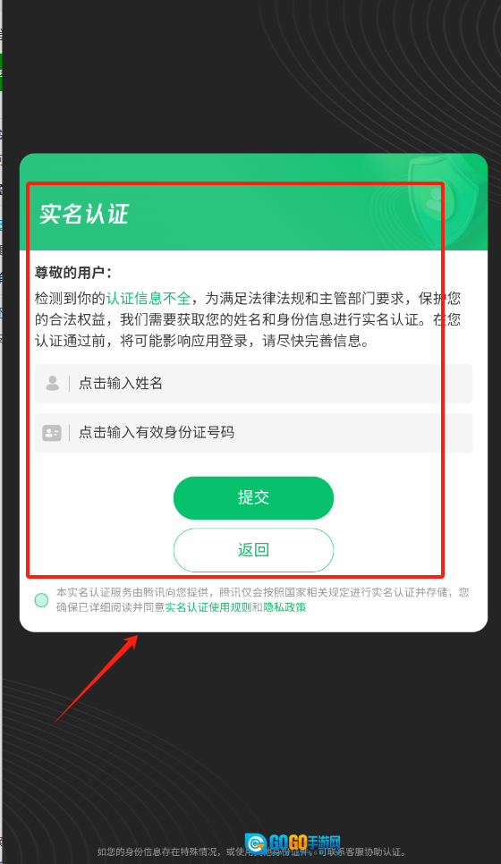 1、在实名认证页面的顶部,清晰显示着“实名认证”的标题。你需要按照页面提示准确填写姓名与身份证号码,填写完成后点击绿色的提交按钮,即可完成认证流程。若在填写过程中出现错误,可点击返回按钮进行修改。