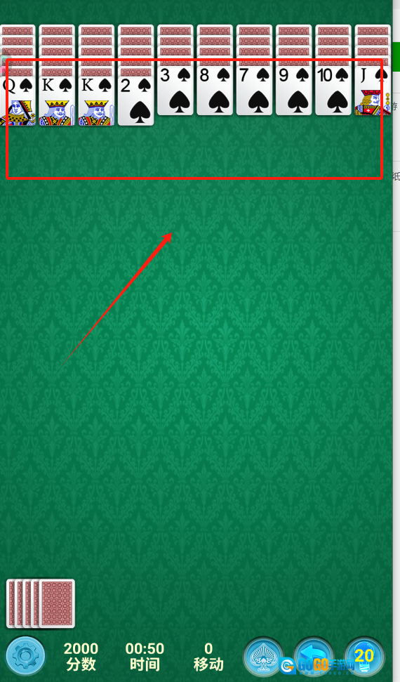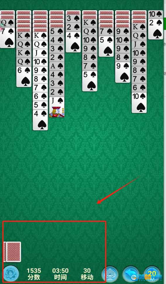 2、纸牌接龙的游戏界面里,顶部横向排列着10张牌。下方的绿色区域是可以移动纸牌的区域,左下角放着还没开封的牌堆,右下角则显示着分数、时间和步数这些信息。