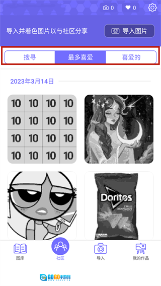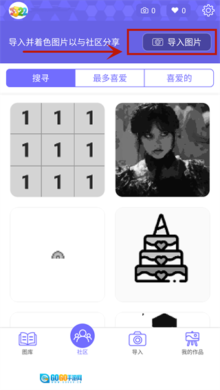 2、社区板块里,你既能搜索到自己喜欢的图片类型,也能导入本地图片进行着色处理,而且还配备了一键分享的便捷功能。
