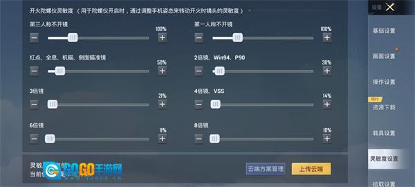 5、开火陀螺仪灵敏度设置如下:第三人称不开镜状态下为100%;第一人称不开镜时同样是100%;红点瞄准镜、全息瞄准镜、机械瞄准以及侧面瞄准镜对应的灵敏度均为50%;2倍镜、win94枪械、p90枪械的灵敏度设置为30%;3倍镜的灵敏度是21%;4倍镜与vss枪械对应的灵敏度为14%;6倍镜的灵敏度为11%;8倍镜的灵敏度则是10%。