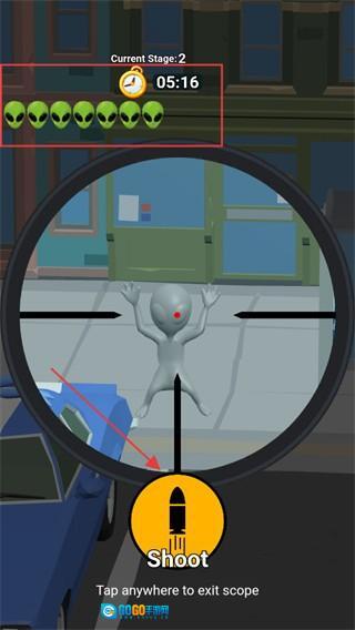 2、玩家的任务是找出那些伪装起来的外星人,通过狙击将它们消灭来完成关卡挑战。