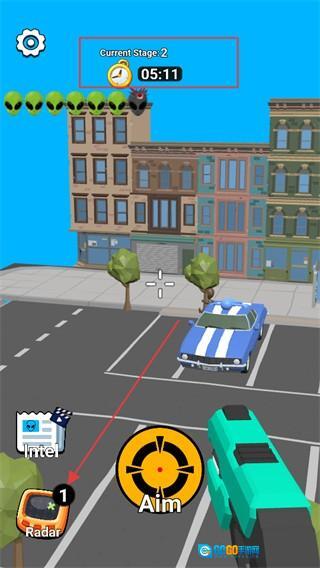 2、借助“Radar”雷达功能,搜索周边外星人的位置以辅助定位,同时需留意功能界面显示的时间信息,从而提高消灭外星人的效率