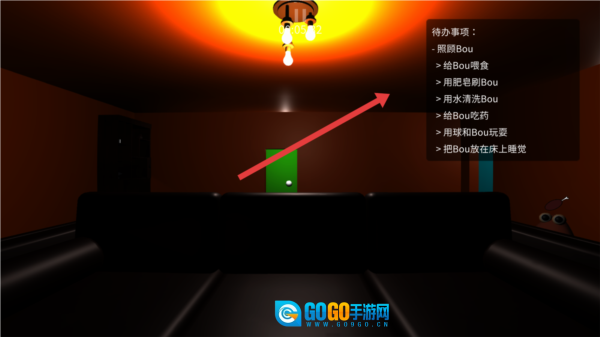 1、照看好Bou:在房间里将Bou安置在白色枕头上后,自己走到床边躺下,关掉灯入睡