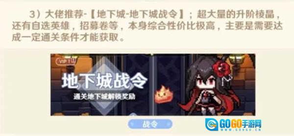 高阶玩家推荐:地下城战令系统,提供超量升阶棱晶、自选英雄以及招募卷等奖励,整体性价比极高,但需满足特定通关条件方可解锁。