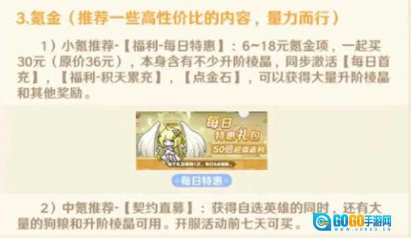 中度投入玩家推荐入手契约直募礼包,该礼包包含自选英雄,还额外附赠大量狗粮与升阶棱晶,尤其适合开服前七天购买。