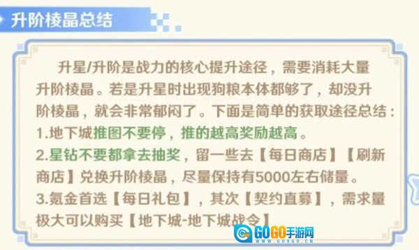 一、说明:升星与升阶是提升战力的关键手段,过程中需要大量升阶棱晶作为材料支撑。