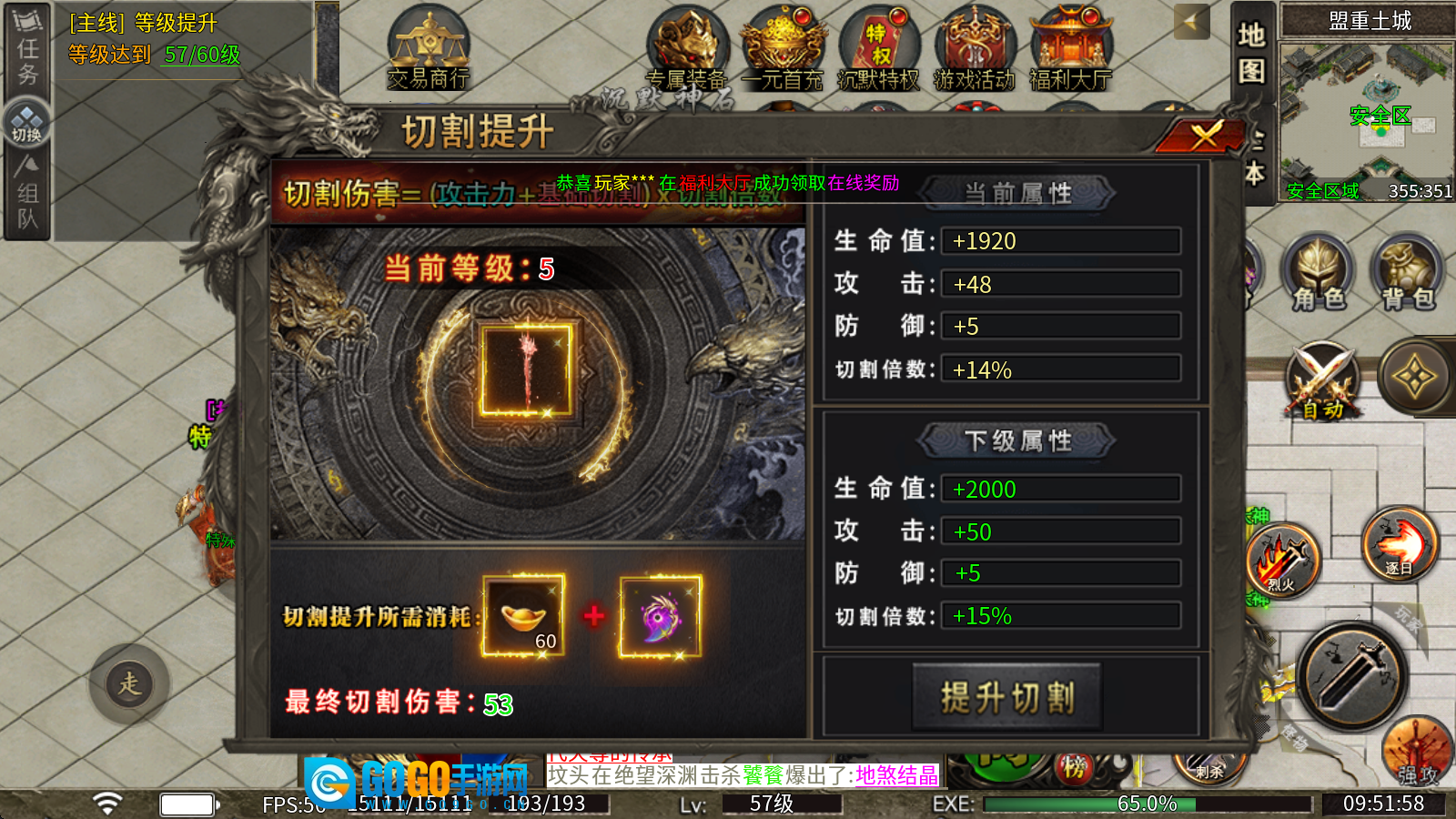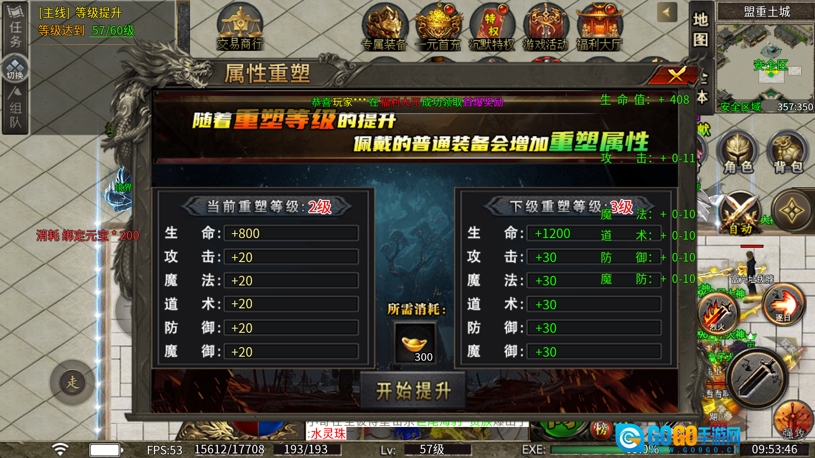 3、属性重塑:消耗元宝就能提升重塑等级,每升一级都能获取丰厚属性,而且随着重塑等级的提高,所穿戴的普通装备也会额外增加重望属性。