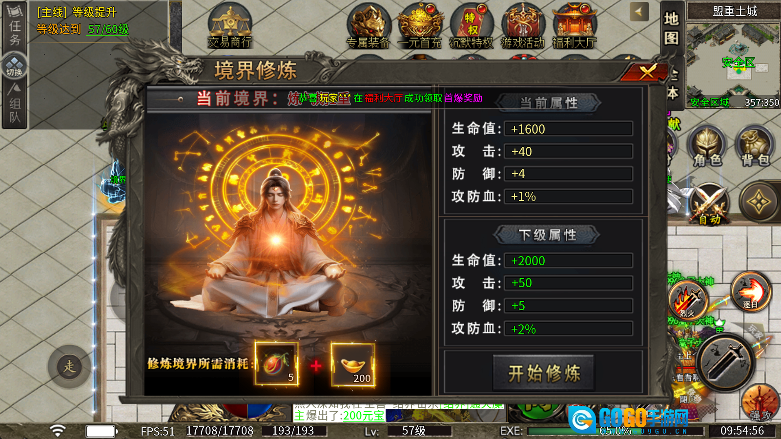 2、境界提升:消耗境界腰果与元宝即可实现晋升,每提升一级都能为角色带来攻防血属性的百分比加成。