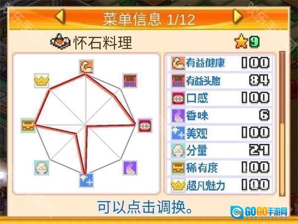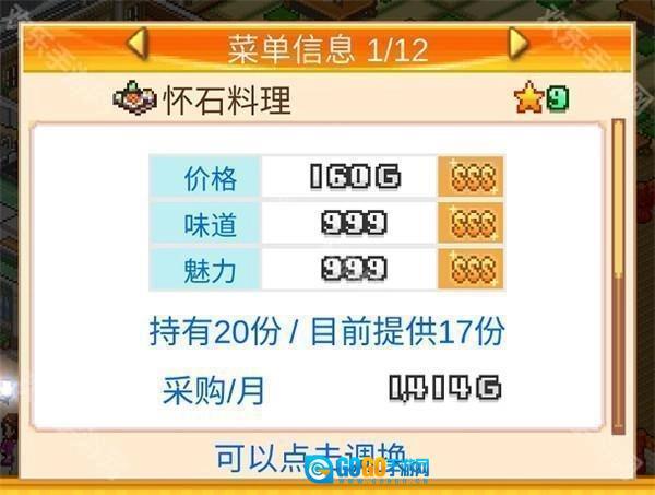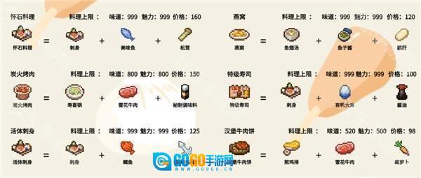 3、而菜品价格也是由八维图的数值直接决定,每个食物都有着其价格、味道、魅力上限,因此在菜品研发上,选择高上限的菜品往往会得到事半功倍的效果!