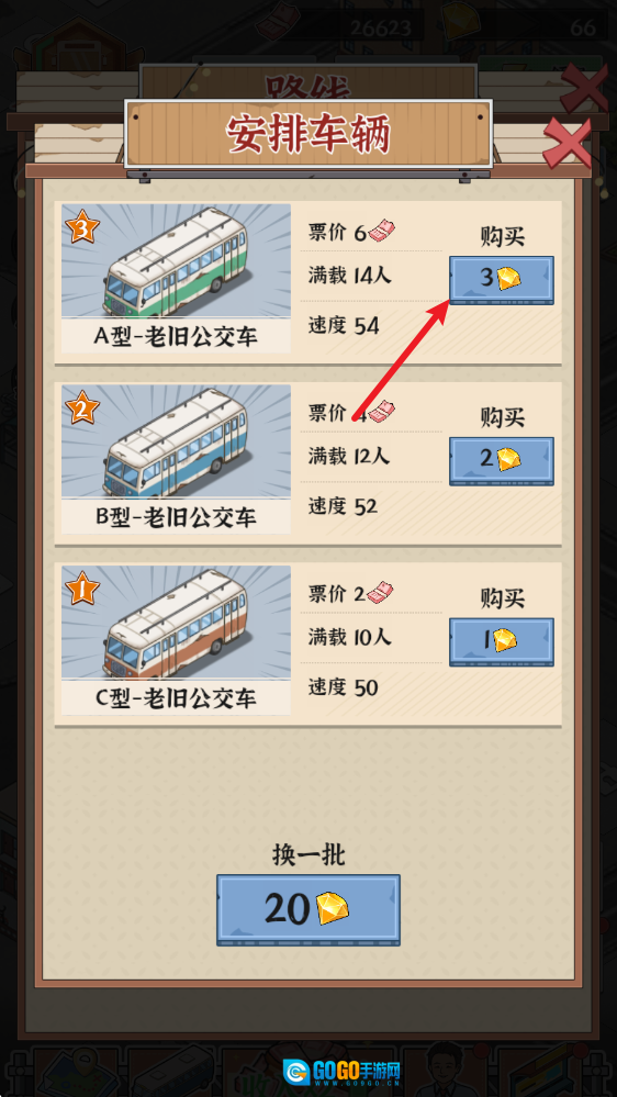 2、挑选一辆公交车启动运营,等级越高的公交车所能带来的收益也会相应更高。