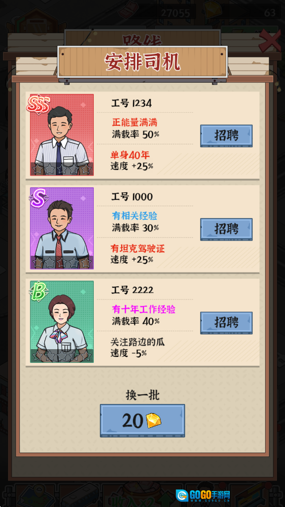 3、还得安排一位司机,司机的等级会影响载客量。
