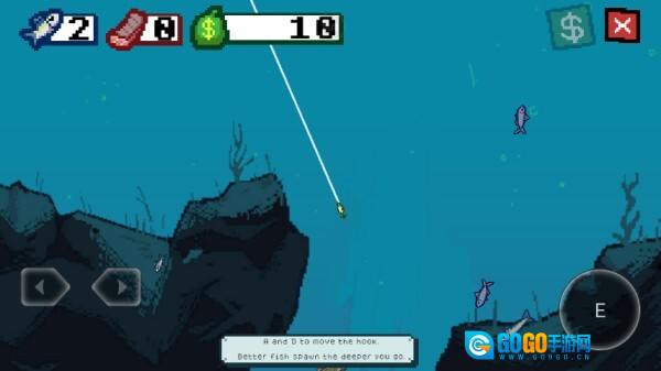 2、玩家滑动至最左侧的钓鱼台,点击E键开始钓鱼,通过左右键来操控鱼竿的方向。