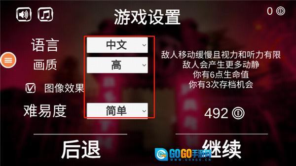 2、进入设置菜单对语言、画质、难度等参数进行调整,待确认所有设置无误后,点击“继续”按钮。