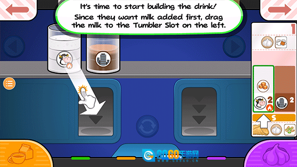 13、该着手制作饮料啦!由于他们打算先添加牛奶,所以把牛奶拖到左边的不倒翁槽里。