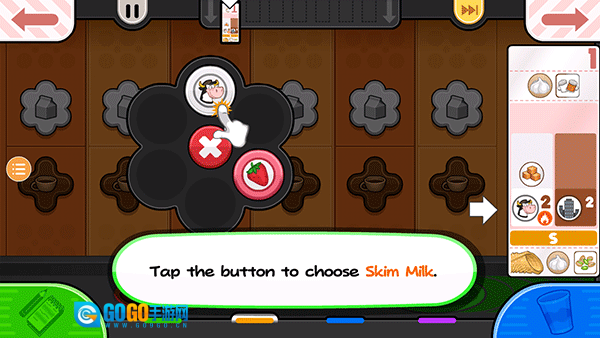 6、Janana需要两杯脱脂牛奶。请点击并按住倒奶按钮,直至玻璃杯中的牛奶量达到2杯。
