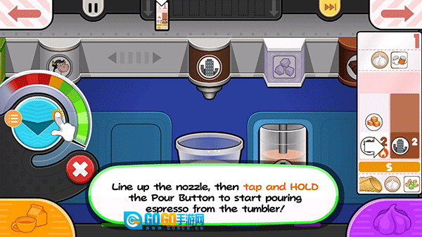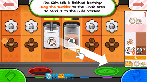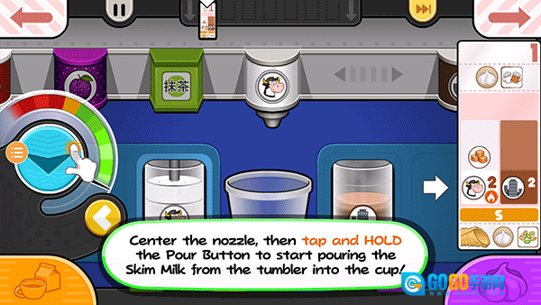 15、从票据左侧的项目处开始拖动容器,让左边的脱脂牛奶杯喷嘴对准杯子上方的中心位置。按住倒奶按钮持续添加脱脂牛奶!要是仪表指针快要接近红色区域,就松开倒奶按钮,等指针降下来之后再继续倒!