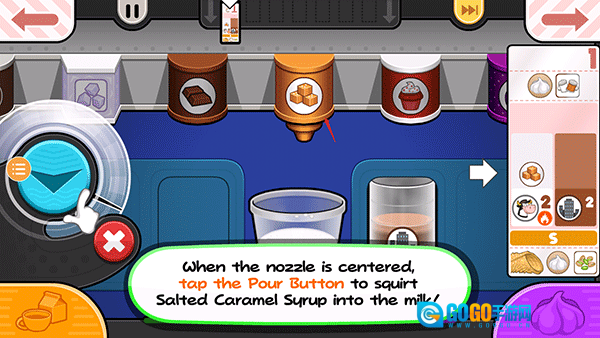 16、这款饮料的制作方法是在牛奶里加入咸焦糖糖浆!请拖动箱子,直至咸焦糖糖浆处于杯子的正中央位置。