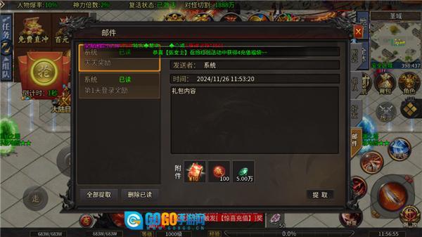 1、进入游戏领取专属礼包,在邮件中还有大量资源