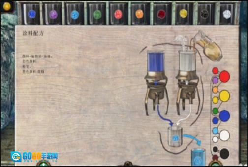 2、倒入操作完成后就可以开始进行调色了,左侧墙壁上贴着一张颜料配方表,大家可以用来参考。