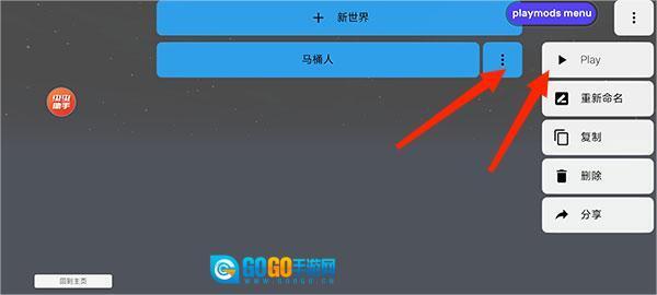 5、在打开的新页面里,找到下图中红色箭头指向的按钮并点击,接着在右侧弹出的下拉选项中选择“play”,就能开始游戏了。
