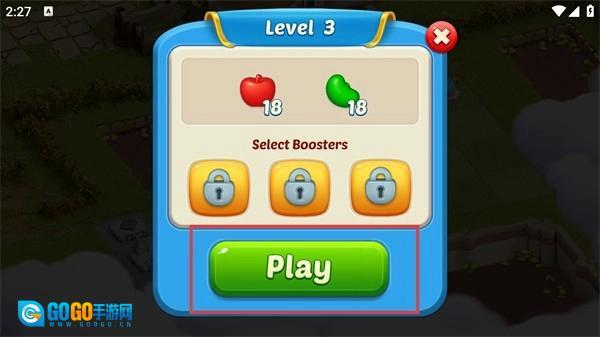 2、在关卡选择界面确认苹果和豆子的收集目标,点击Play按钮正式进入第三关的消除场景。