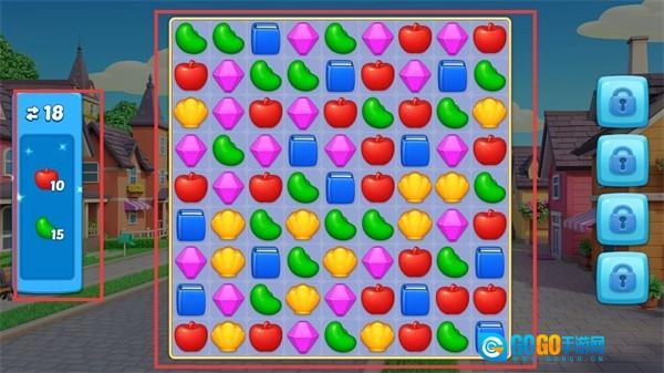 3、在消除关卡中匹配相同物品,优先收集苹果和豆子,达成各18个的目标以推进进度。