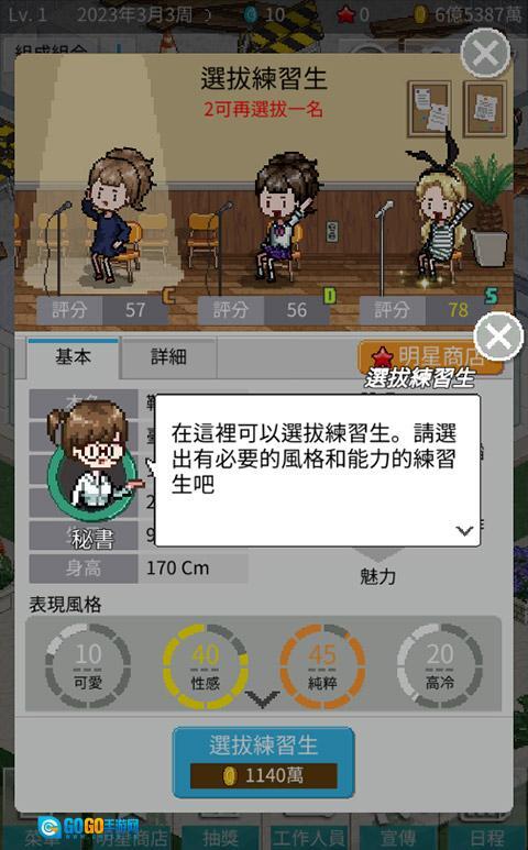 这款游戏围绕偶像培养展开,玩家将以经纪人的身份,通过招募新人、制定训练计划、提升艺人能力等方式,助力他们成长为备受瞩目的明星。游戏采用复古像素画风,搭配活泼的音效,营造出轻松的氛围。在游戏过程中,玩家可以通过完成各类任务获取资源,不断提升自己的运营能力,最终打造出顶尖的偶像团队。
