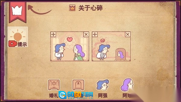 先把婚礼拖到左边的框里,接着把阿强和阿珍也拖进左边框完成结婚;之后将墓地拖入右边的框,再把阿强拖到右边框的坟地旁边,最后把阿珍拖进坟地,就能顺利通关了。这段流程讲述的是阿强与阿珍步入婚礼殿堂,数年后阿珍离世,阿强因此心碎的故事。