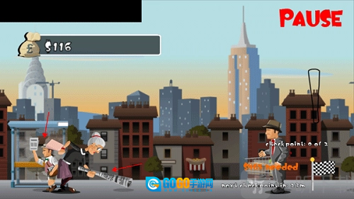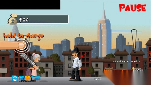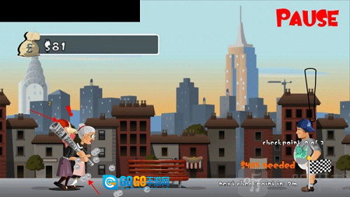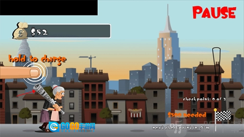 2. 她手里握着一根棒球棒,在街道上四处击打行人,从他们身上获取金钱。你的任务是协助这位老奶奶打出更多金钱,按住操作键一段时间进行蓄力,就能打出更多的钱。
