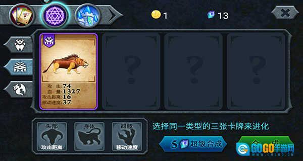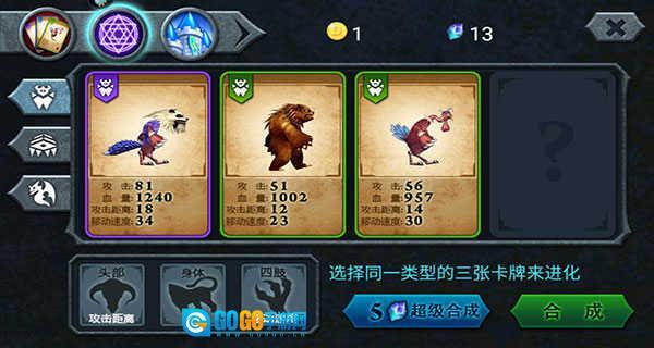 新手进阶必学游戏技巧: 1. 兽王进化:此操作可提升兽王的能力,但需注意,进化过程要消耗三张卡牌,且能力增长的性价比偏低,不适合在游戏前期采用。另外,绿色和蓝色品质的卡牌不建议进行进化,建议留到后期针对紫色卡牌使用进化功能,以此突破紫卡自身的能力上限。