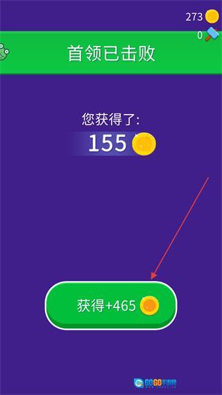 4、战胜首领之后,点击“获得+465”按钮,就能领取通关奖励的金币了。