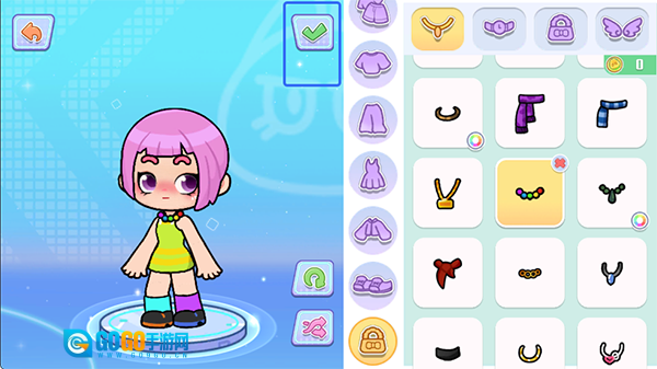 3、接下来玩家可以为角色挑选五官、服饰、帽子、眼镜、发夹、衣服、头饰等外观元素,创建完成后点击上方的√按钮确认即可。