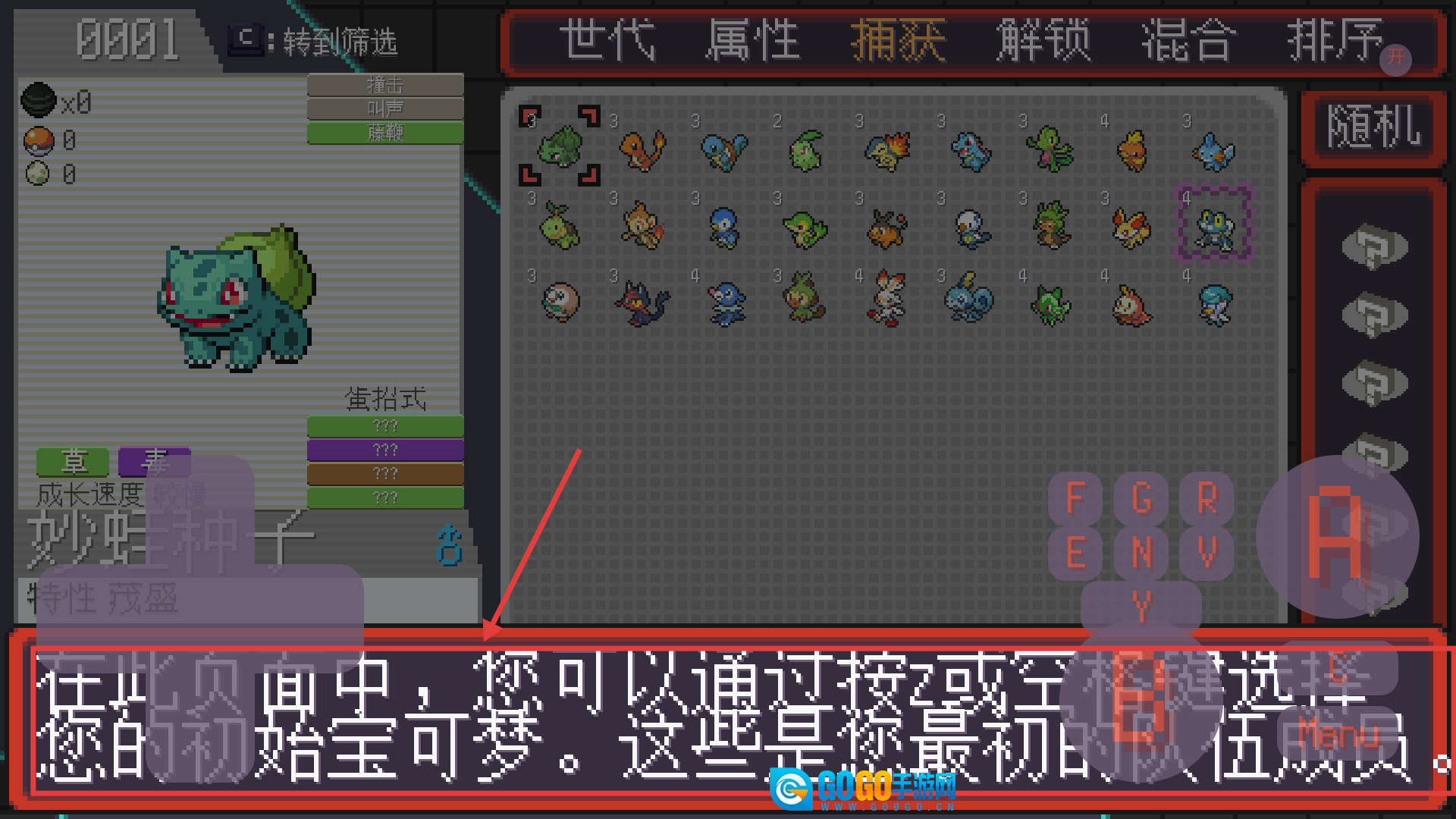 2、在宝可梦选择界面按下【Z】键或空格键来选定初始宝可梦,随后使用10个指数点对初始队伍的配置进行优化。