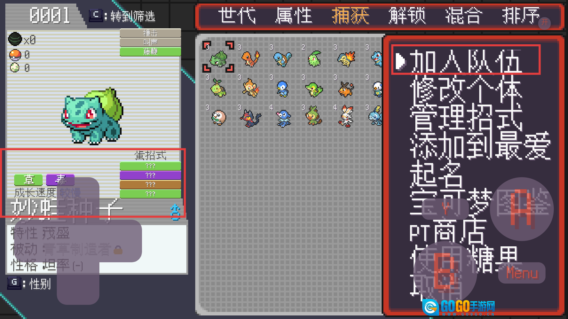 3、在宝可梦管理界面选择【加入队伍】选项,将选中的宝可梦编入队伍,还可以通过修改个体值或管理招式来提升其战力。