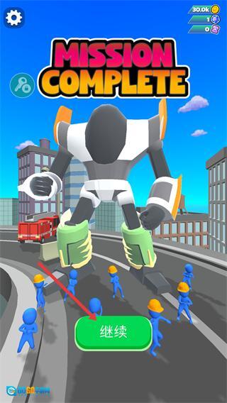 4、成功击败敌人后,点击【继续】按钮返回游戏主界面,为提升机甲的战斗力做准备。