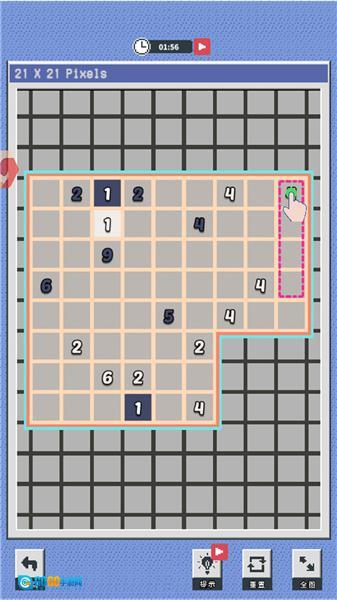 进入游戏后,系统会自动把图片划分成不同区域,你需要根据区域内的数字,用尺寸各异的矩形把所有区域都填满。