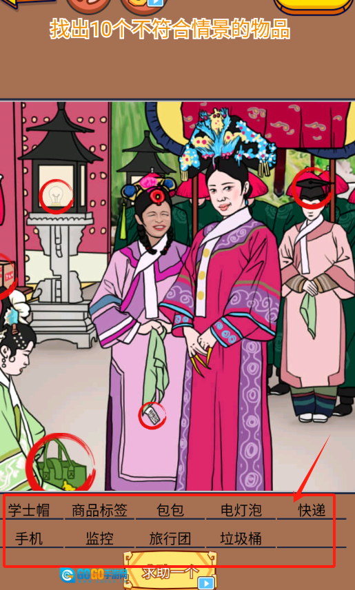 3、在古装宫廷这类主题场景里,参照红框清单,准确点击电灯泡、手机这类与情景不符的现代物品来完成任务。