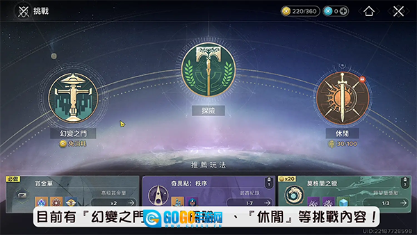 2.探险板块:对应资源本,包含和稳港行动、九巨头国度、莫格兰之猎、遗产等关卡,各关卡分别产出武器、模组、神器、圣物相关材料。