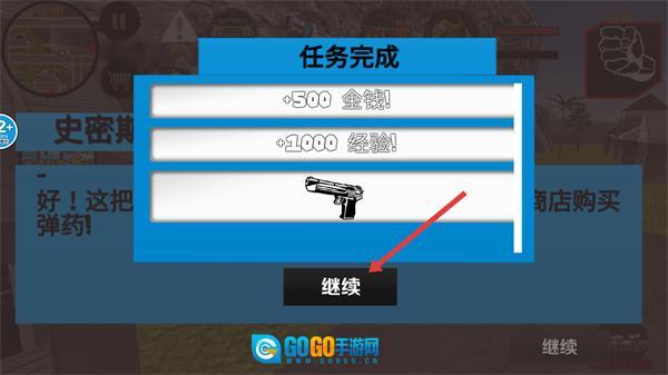 完成任务后可获得【+500金钱!】【+1000经验!】以及武器奖励,点击【继续】即可进入后续挑战。