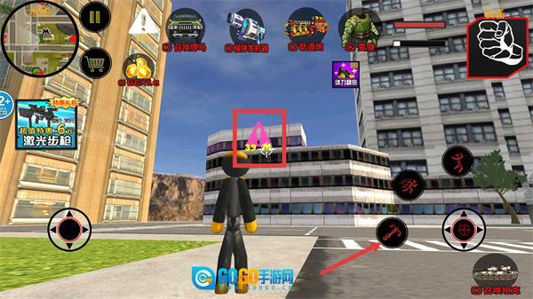 1、操控火柴人移动到目标标记的位置,点击相应按键来触发互动,以此推动当前跑酷任务的进程。